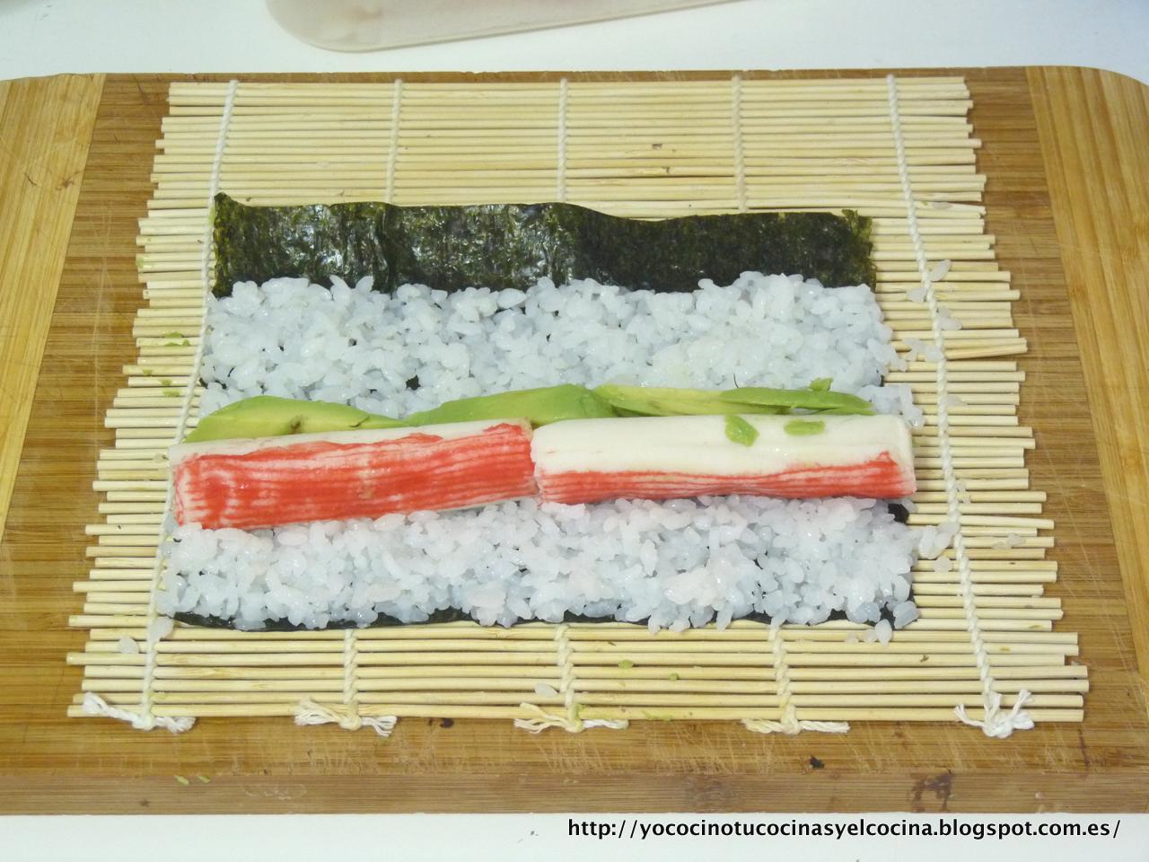 Los rellenos, a vuestro gusto, a mi me gusta poner un pescado (surimi, atún, salmón, el que sea...) combinado con aguacate, o pepino, o tortilla japonesa (esa ya la veremos otro día) y con otro cualquiera que puede ser repetición o algo tan bueno y original como un queso crema. Como ya he dicho otras veces, como límite... vuestra imaginación.